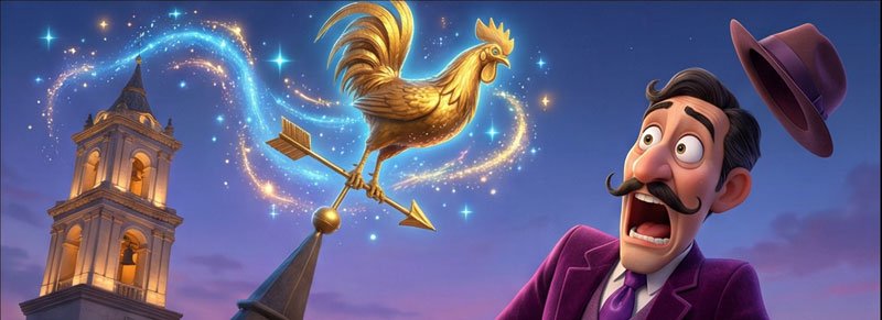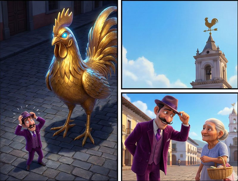 Don Ramón se frotó los ojos. El gallo de la veleta, que siempre miraba al norte, giró su cabeza hacia él. Con un movimiento elegante, el ave de hierro batió sus alas y, envuelta en un destello de luz dorada, descendió del cielo como una estrella fugaz. Al aterrizar en el empedrado, el gallo no era pequeño; era un ave majestuosa, con plumas que parecían hechas de espejos y ojos que brillaban como carbones encendidos.