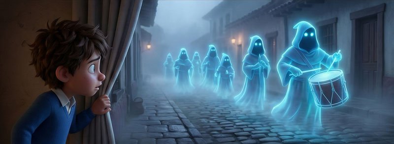 Al descorrer la cortina, vio algo increíble. La calle no estaba oscura; estaba bañada en una niebla azul brillante. Una procesión de encapuchados flotaba sobre el suelo. No tenían pies. Llevaban velas largas que no se apagaban con el viento. Y al frente, un ser enorme golpeaba un tambor viejo y destartalado: La Caja Ronca.
